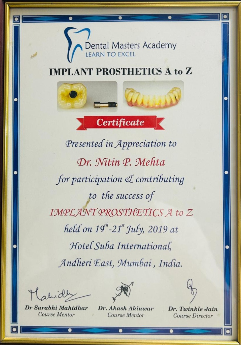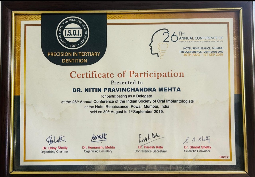 Dr. Nitin Mehta having more than 24 years of clinical experience in General Dentistry and Implant dentistry. After working for Two years with various renowned Dentists of Gujarat, He finally established the clinic in August 2000 at a small space of 150 Sq feet with one dental chair. The idea was to setup and make available an advance international quality dental practice that would be painless during the treatment and give value return for each penny that the patient pays, which is uncompromising in ethics, availability of doctor’s appointment, use of international quality of material, latest dental equipments, training staffs and high integrity practice.